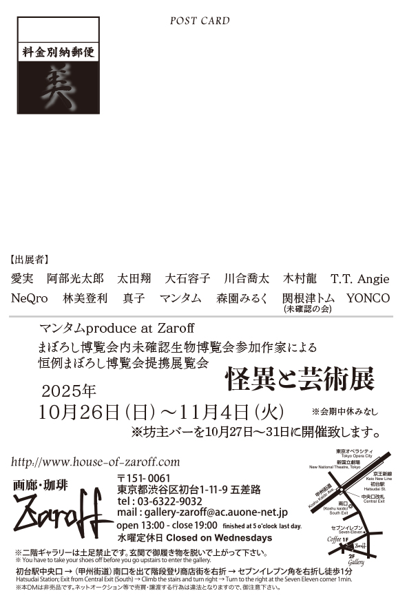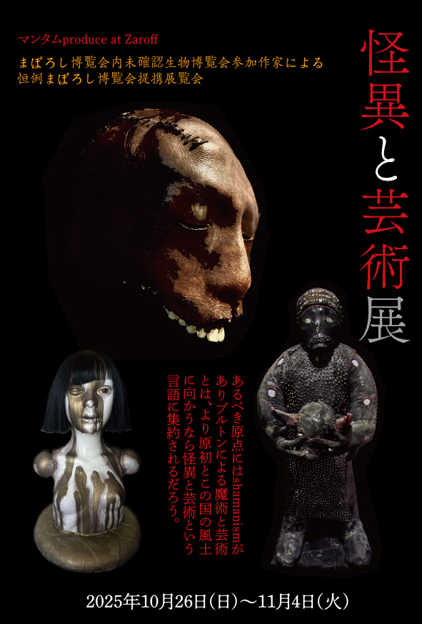 マンタムproduce at Zaroff まぼろし博覧会内未確認生物博覧会参加作家による 恒例まぼろし博覧会提携展覧会 怪異と芸術展 ※会期中休みなし 10月27日〜31日に坊主バーを開催します。 【出展者】 愛美 阿部光太郎 太田翔 大石容子 川合喬太 木村龍 T.T.Angie NeQro 真子 マンタム 森園みるく 関根津トム(未確認の会) YONCO